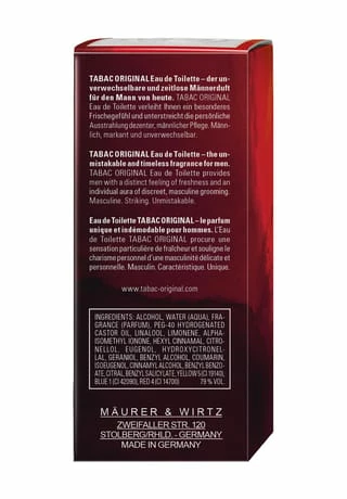 TABAC ORIGINAL ist der Klassiker unter den Herrenduftserien. Mit seiner vielfältigen Produktrange ist TABAC ORIGINAL die Lösung für die individuellen Duft- und Pflegebedürfnisse des modernen Mannes. TABAC ORIGINAL überzeugt durch eine herb-würzige Dominante. Abgerundet wird der Duft mit Edelhölzern, Moschus, Ambra und blumigen Noten.